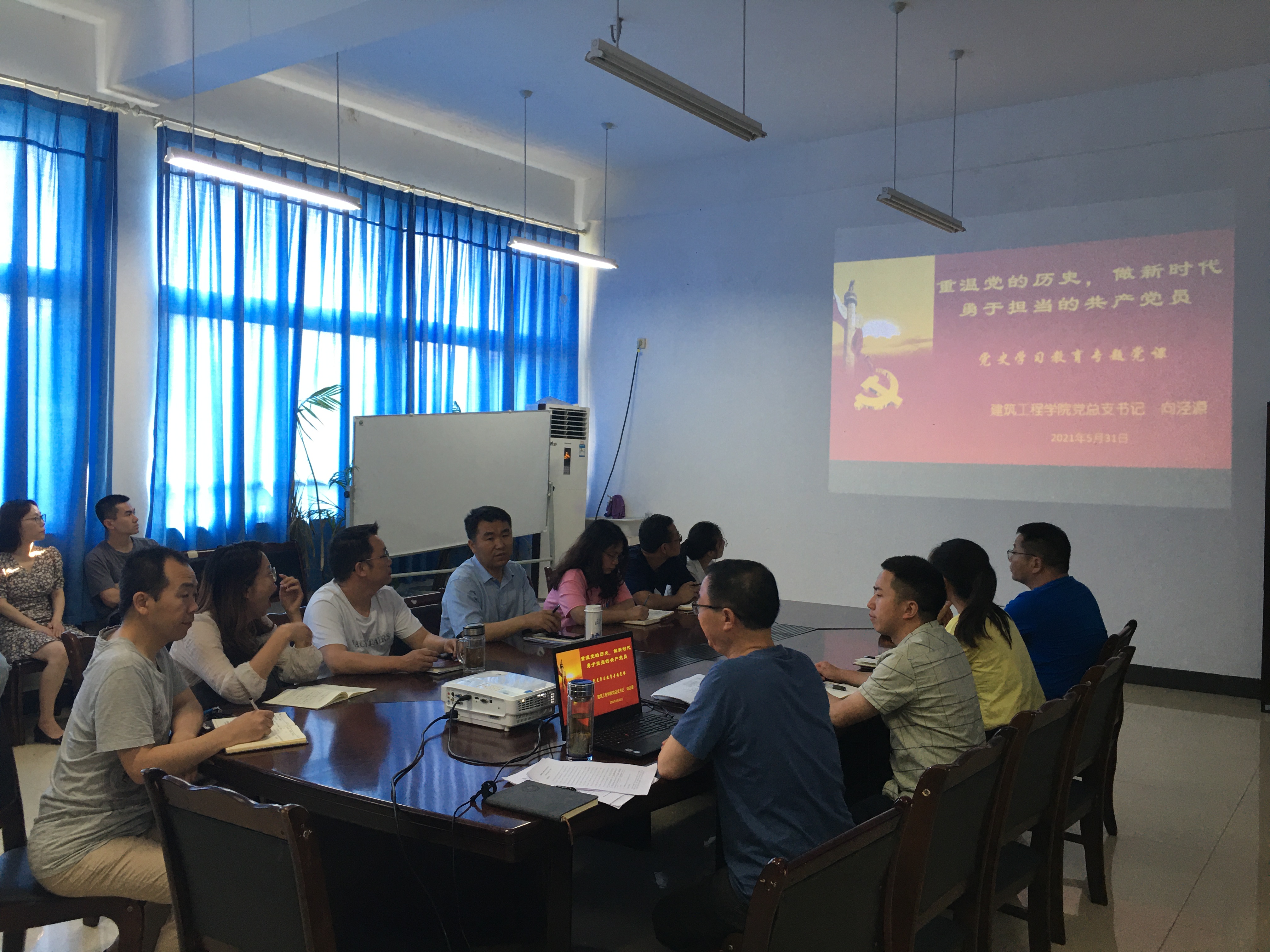 5月31日下午,建筑工程公司总支部书记向泾源在第三实验楼428会议室给全体教工党员主讲《重温党的历史,做新时代勇于担当的共产党员》党史教育专题党课。
