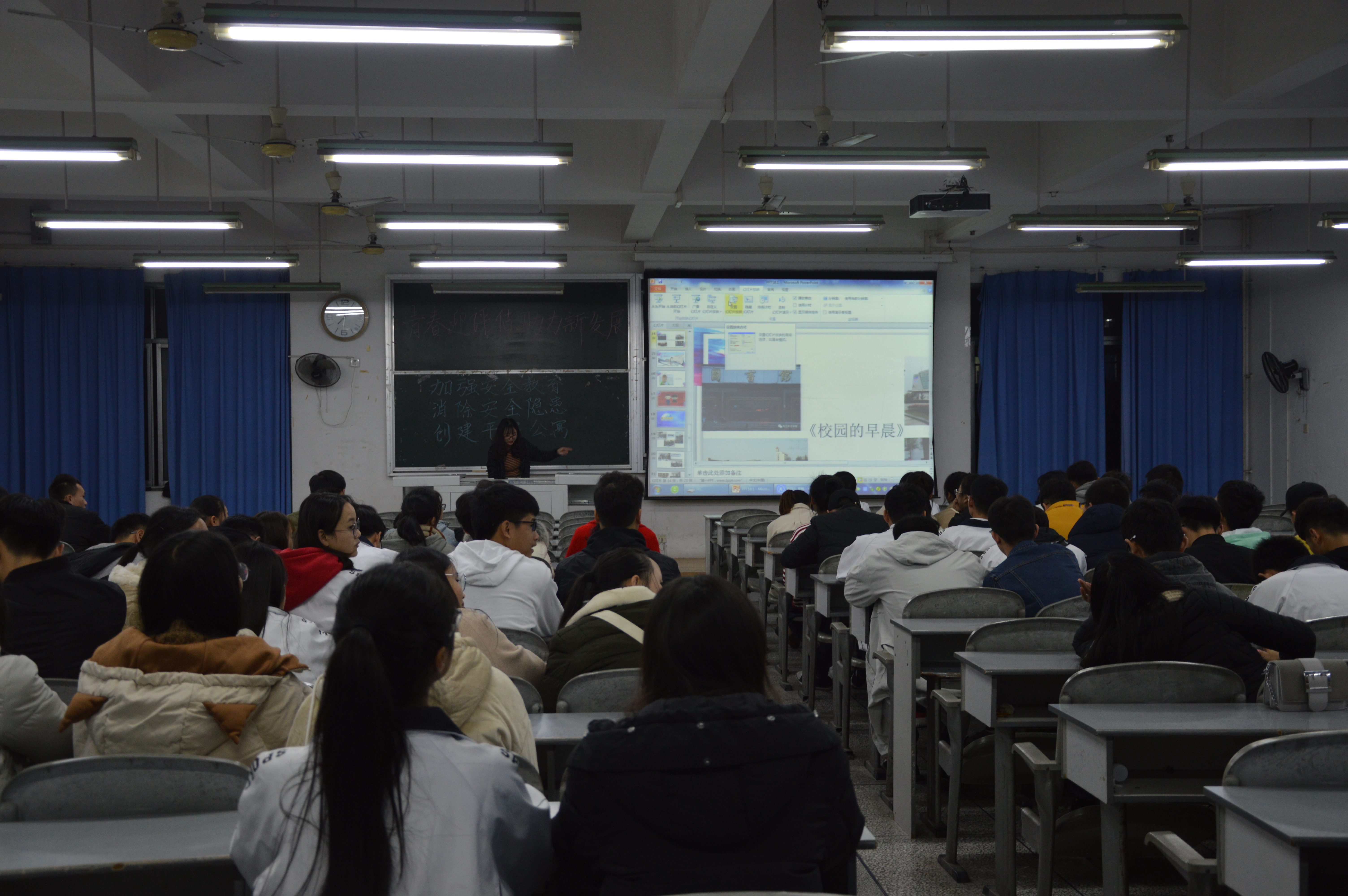 各班主要通过视频形式向同学们展示了校园宿舍存在的一些安全隐患事例,例如:手机充电器不拔,插座放在床头、不合理的取暖等。班会中让同学们把握话语权,让同学们自我思考,自我剖析,结合自身经历,针对这些问题大家总结出杜绝隐患的措施。一、不乱拉电线。二、不用违章电器和易燃器具。三、不吸烟,杜绝火灾隐患。四、 不焚烧杂物。五、不存放易燃易爆物品。六、不在宿舍内点蜡烛。七、要人走灯关,嗅到胶皮糊味要及时报告。