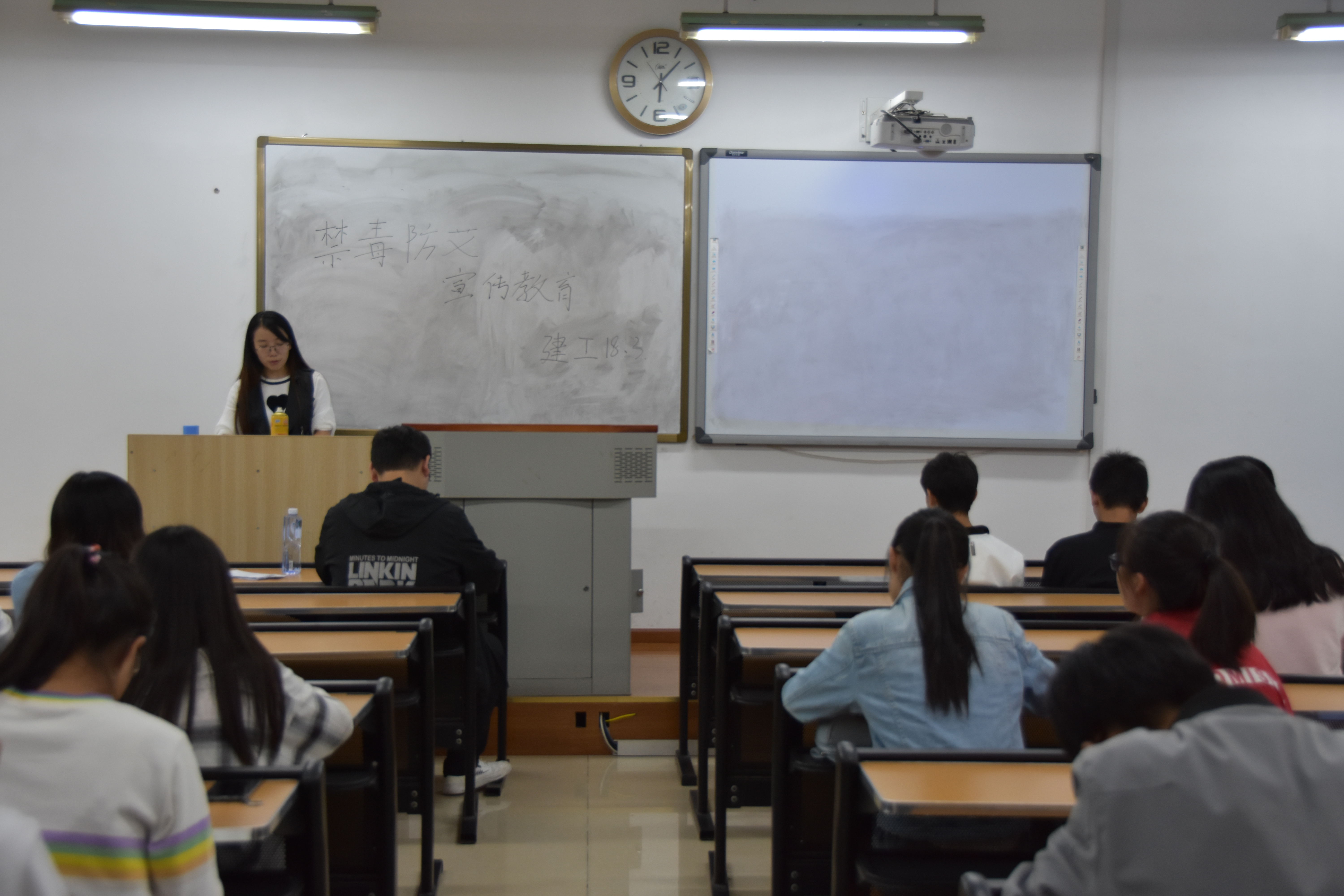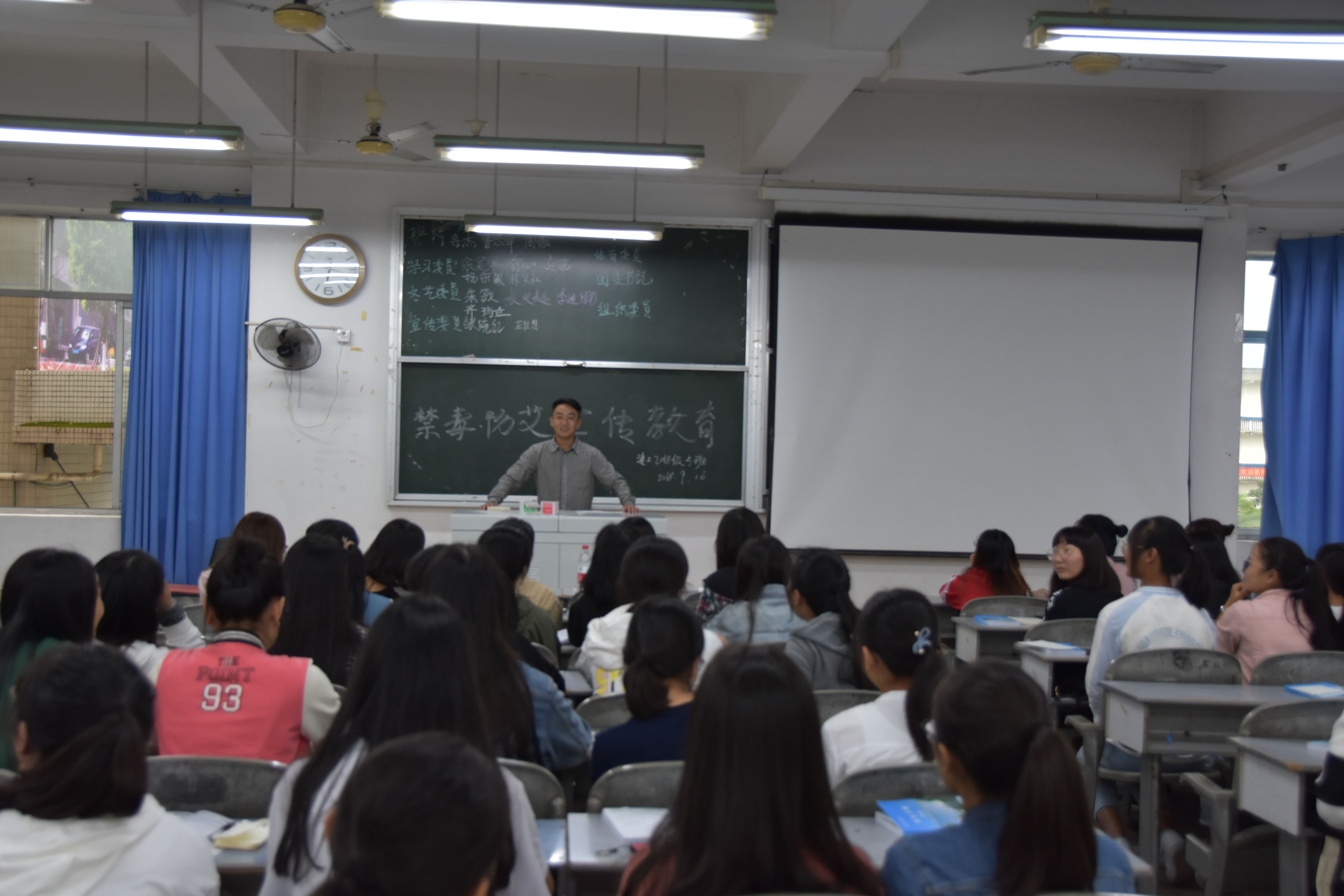 入学教育中,18级2班班助分发防毒防艾宣传单,为新生们讲解传单内容,18级1班、3班、4班与5班由班主任强调防毒防艾相关知识,讲解人主要介绍了什么是艾滋病、健康人是怎样感染艾滋病病毒的、感染了艾滋病会有怎样的症状、吸毒者是如何感染艾滋病病毒、毒品是什么以及毒品的危害。