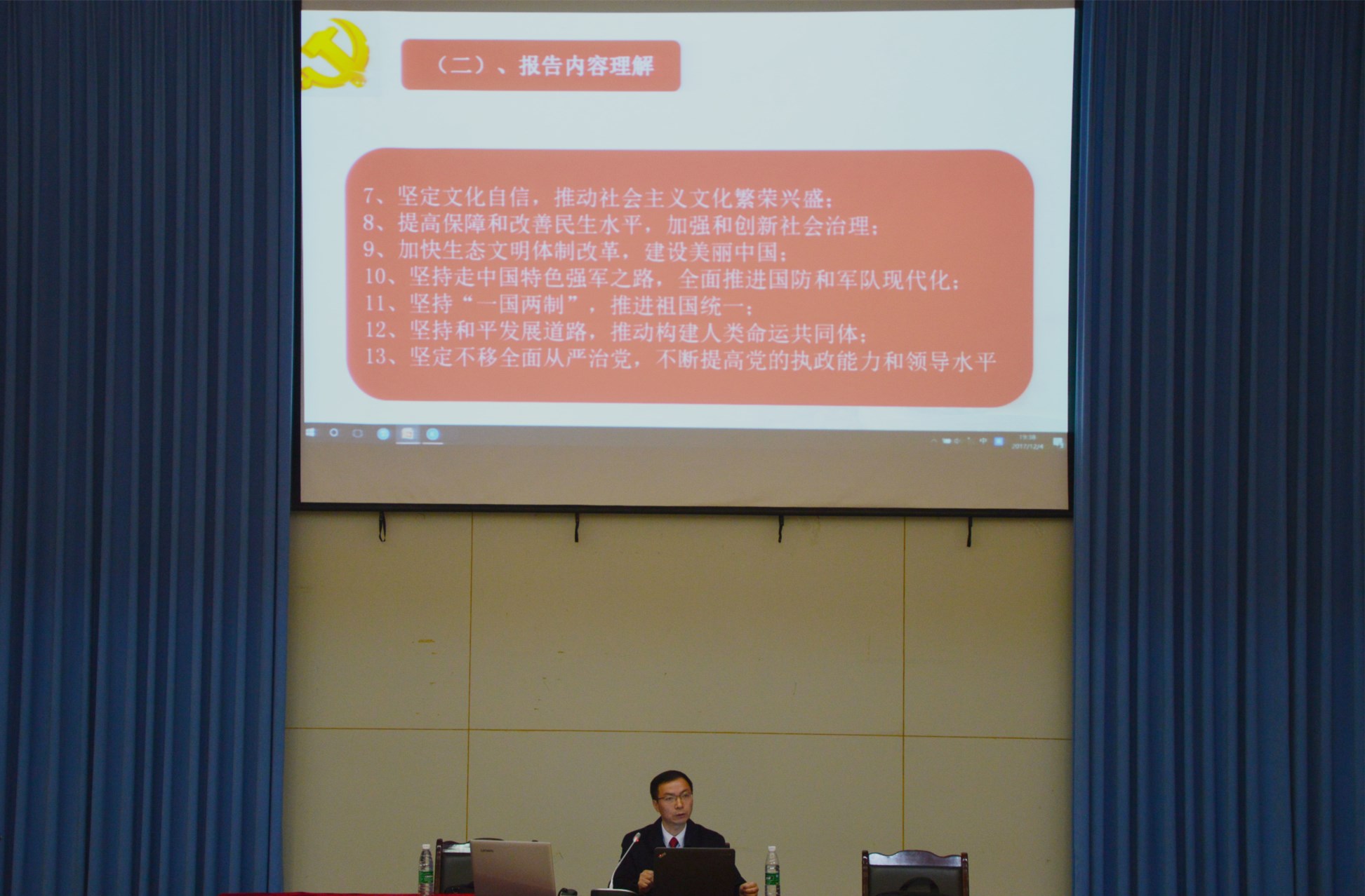 报告一开始,向书记对全体党员师生提出要求。希望大家认真聆听宣讲,要求党员要真正逐步地读懂、弄通和落实十九大会议精神。接着,向书记分别对报告的主题和13部分内容及它们之间的逻辑关系进行了详细的解读。解读过程中,他重点针对报告中我国经济人均GDP、对世界的贡献率及我国在武器、通信等方面的重大科技成果为大家作出详细阐述,并重点说明了报告中我国在高端制造、贫富差距、民生问题、生态环境、文化建设、经济建设等方面的欠缺和不足。他强调,经济是国家的基础支撑,广大师生应深刻了解其重要性。同时,文化是一个国家的灵魂,我们应坚定文化自信,坚定不移地推动社会主义文化繁荣。对于生态环境问题,绿水青山就是金山银山,全党师生应积极响应十九大号召,为保护生态尽一份力。