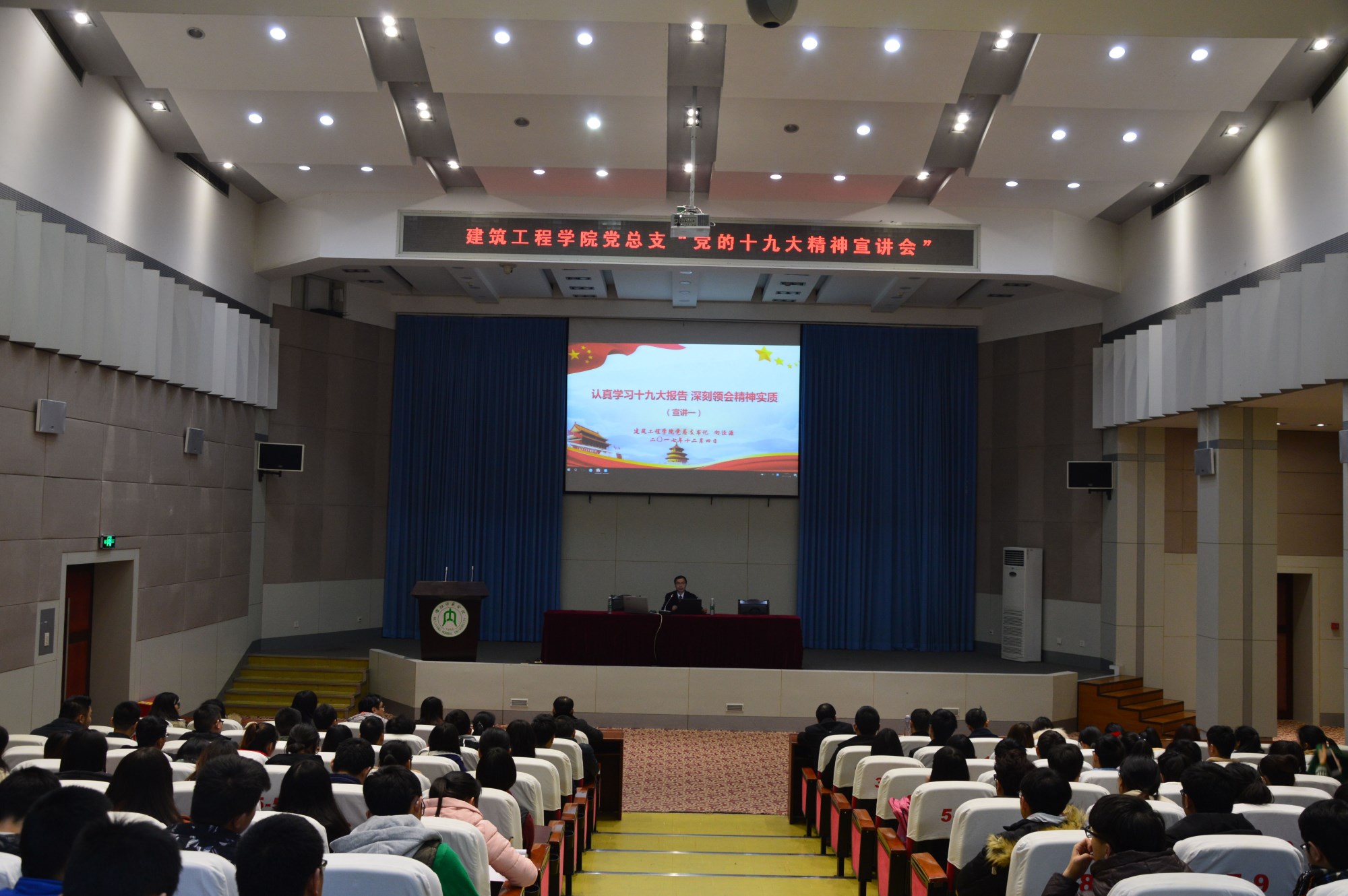 为引导建筑工程公司广大党员同志及入党积极份子认真学习十九大报告,深刻领会其精神实质,12月4日晚7点,建筑工程公司党总支在第一学术报告厅召开党的十九大精神宣讲会。本次党课的主讲人是建筑工程公司党总支书记向泾源同志。建筑工程公司全体教师党员、员工党员、预备党员及入党积极份子一同聆听本次宣讲报告。