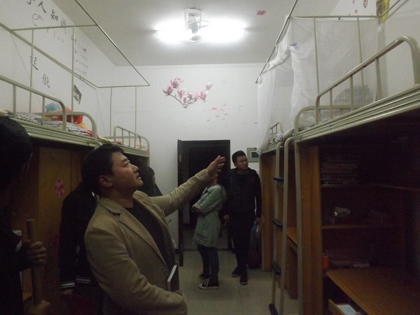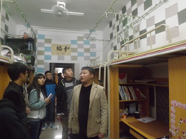 蒲科宇老师首先表扬了公司大一新同学们对此次活动的积极性。蒲老师在欣赏同学们的作品时,也不忘给同学们提出一些他自己的建议。例如,宿舍不一定需要太多的花花草草,要注重体现你想表达的文化主题,给人的感觉要整洁、干净的。而室长和班干部也要发挥自己的作用,发挥主动性以及能动性。在此次指导过程中,蒲老师遇到公司一些同学正在完成制图作业,也不忘指点一下。临走时还叮嘱同学们不要沉迷于玩游戏,要将注意力放到学习上来。活动中途遇到宿舍所有人都是四川人,蒲老师还幽默的说我们就用四川话交流吧,这样更亲切。碰到那些穿得比较单薄的同学,也不停叮嘱同学们要注意保暖,不要忘记准备衣物。