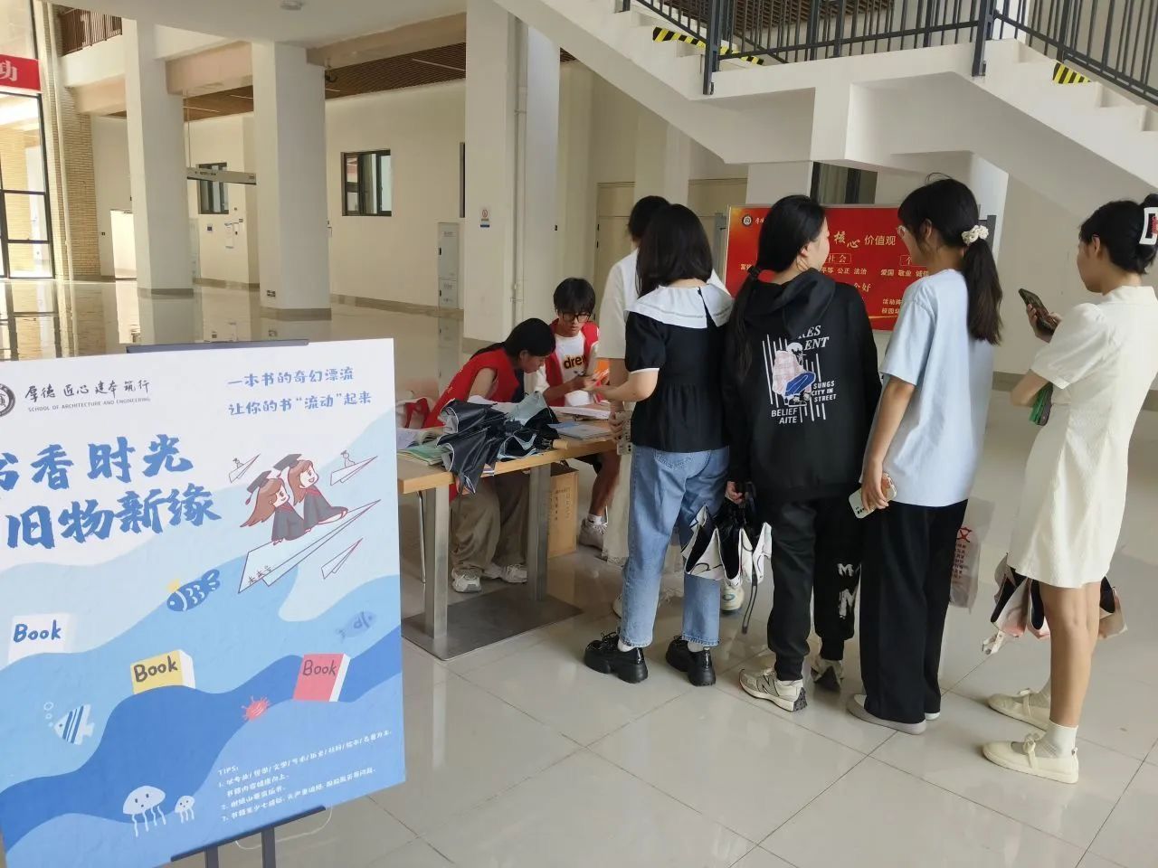 活动根据班级数分为四个场次,活动现场捐书学子络绎不绝,由志愿者收集、登记、分类、造册,捐赠书籍以专业、文学、历史、名著为主,部分毕业生还在书上留下了对学弟学妹的祝福,意义非凡。