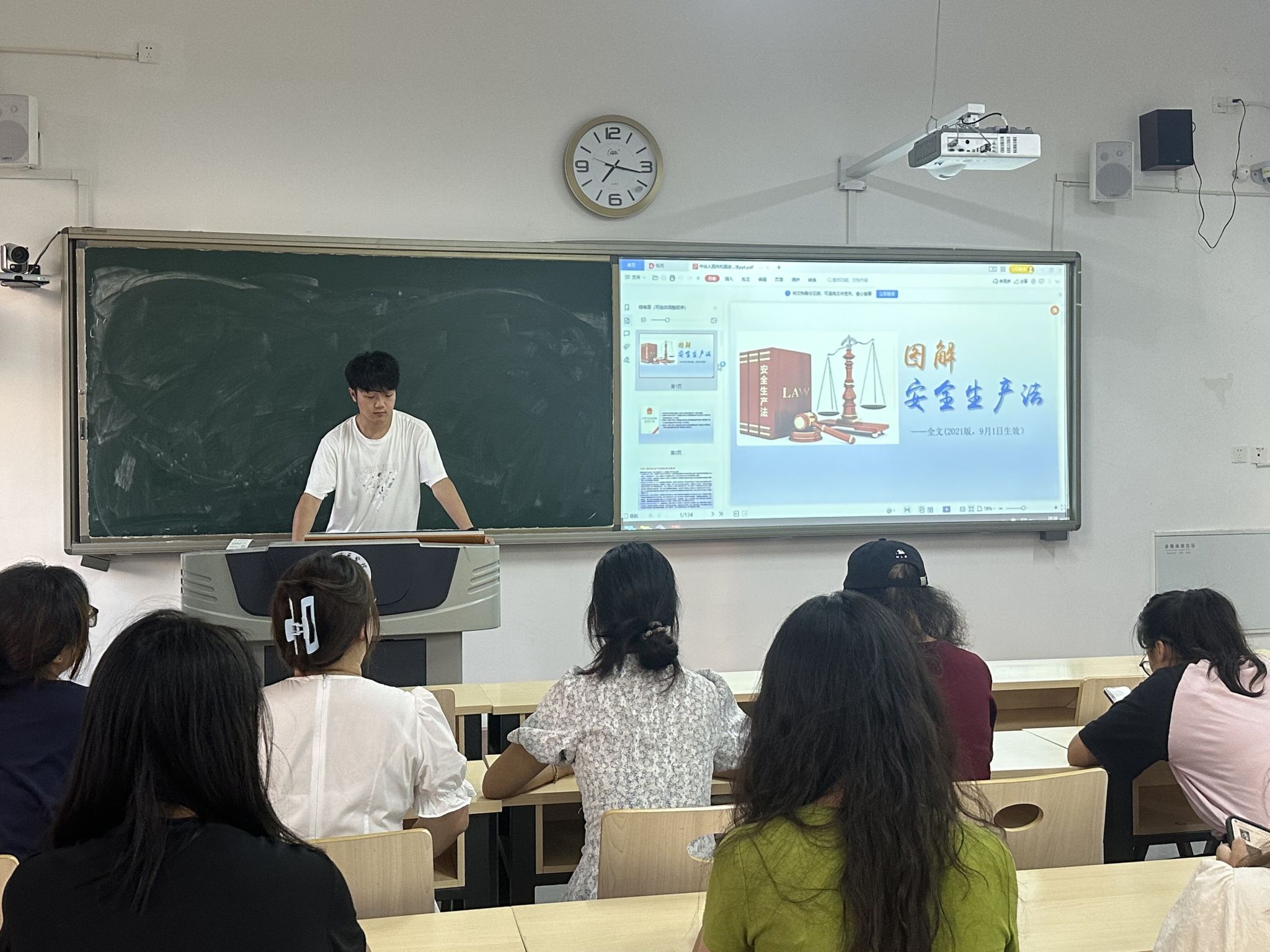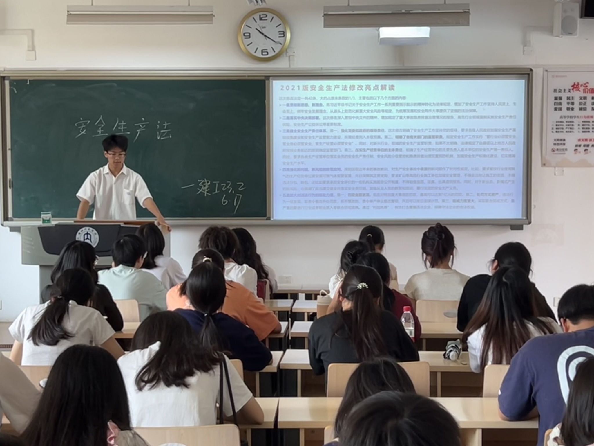 今年的安全生产月主题为“人人讲安全、个个会应急——畅通生命通道”。班会上,由班长向同学们介绍了今年安全生产月的主题,从人员的安全生产义务进行举例说明,并对《中华人民共和国安全生产法》进行简单讲解。最后,通过分析生产安全事故案例,同学们互相分享了应急逃生和自救技巧,推动安全知识在员工心中落地生根。