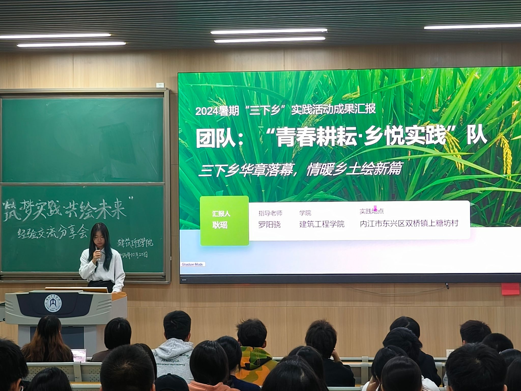 首先上台分享的是“青春耕耘,乡悦实践”实践队。暑假期间,建工学子走进内江市东兴区双桥镇上糖坊村开展“薪火传承”党员志愿活动。