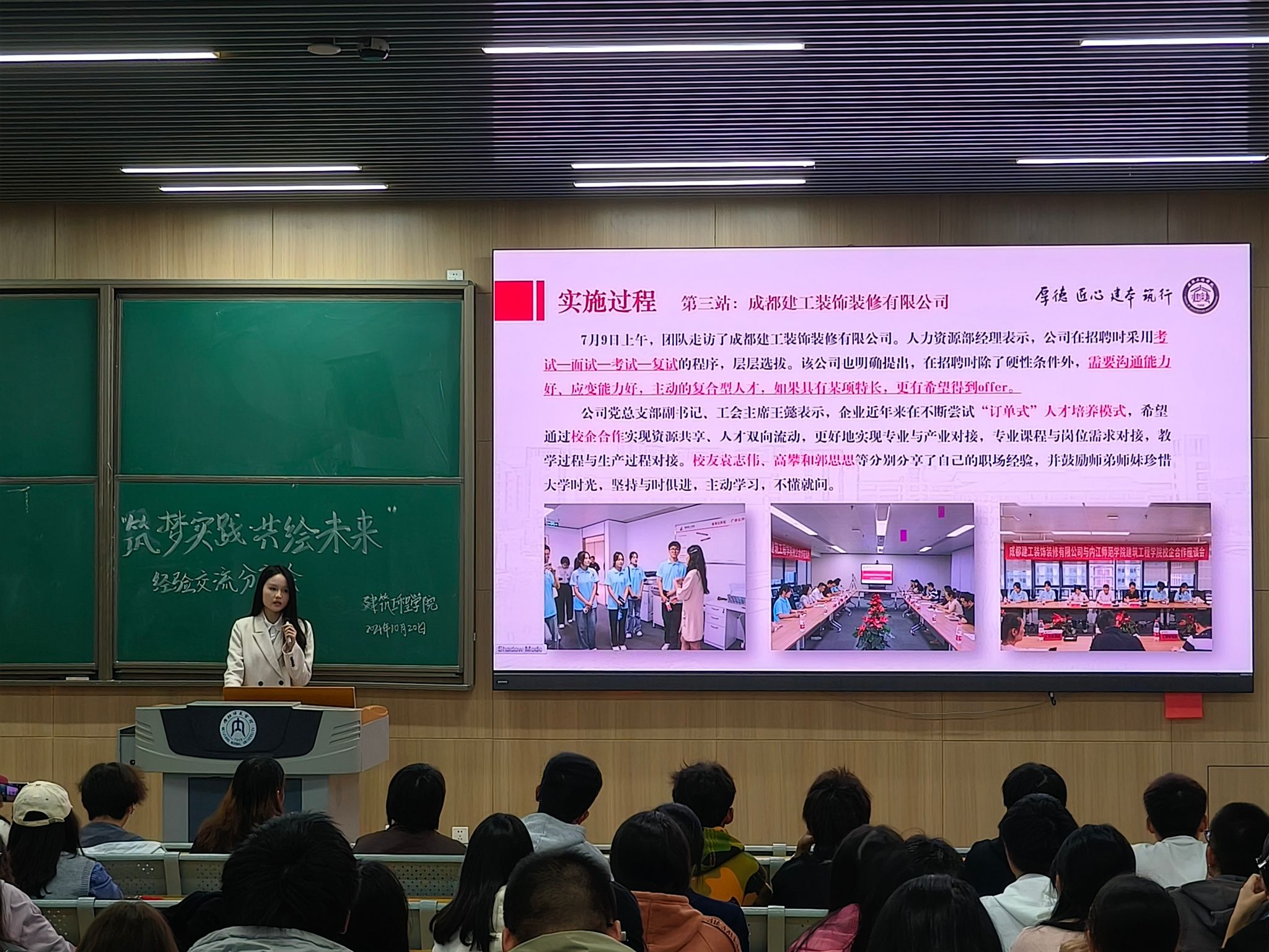第二组汇报的是“匠心筑梦,职企未来”实践队。团队成员在指导老师的带领下,前往中正天达建设集团有限公司、成都建工装饰装修有限公司等四家企业进行深入交流。