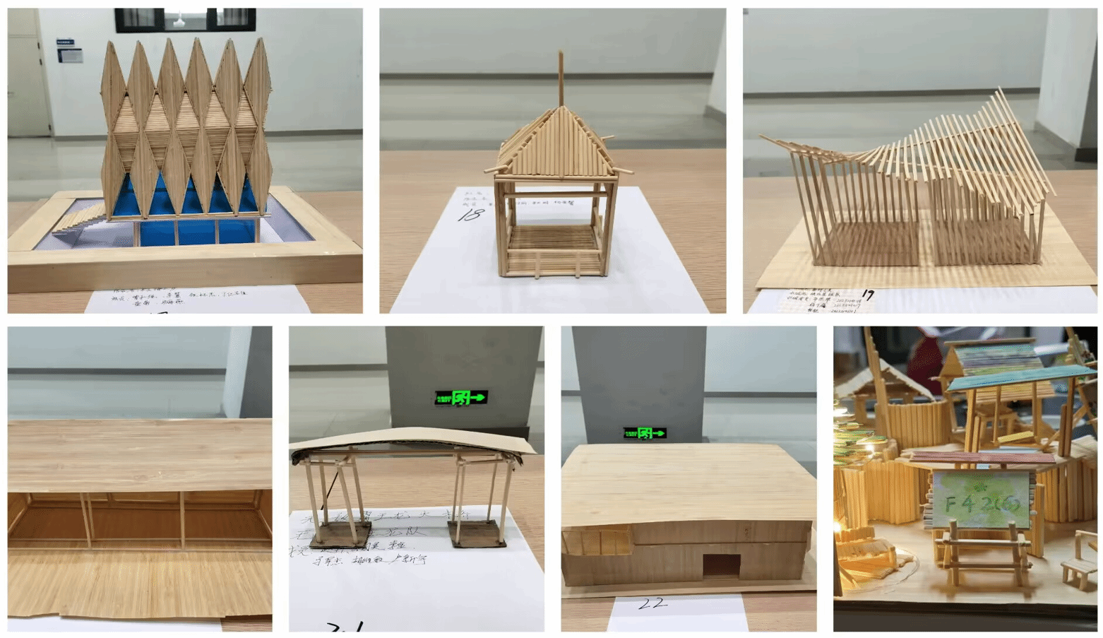 本次大赛共有23支队伍参赛,通过组织线上投票、评委初审选拔,共有14支队伍进入决赛。决赛中,各支队伍以PPT汇报的形式阐述本团队的模型制作理念、制作手法、团队协作过程等,并在现场展示了成果,评委老师从设计理念的新颖性、作品制作的精细度、PPT汇报的流畅度及建筑功能的牢固性等方面对每组作品给出客观评价和综合打分。最终,经现场评委综合评比,作品《家的一角》获一等奖,《木尖塔之梦》《砂糖居》获二等奖,《理想》《逸趣清居》《长江茶苑》获三等奖。