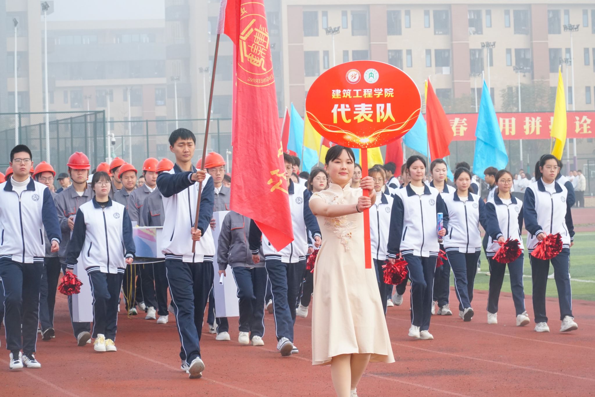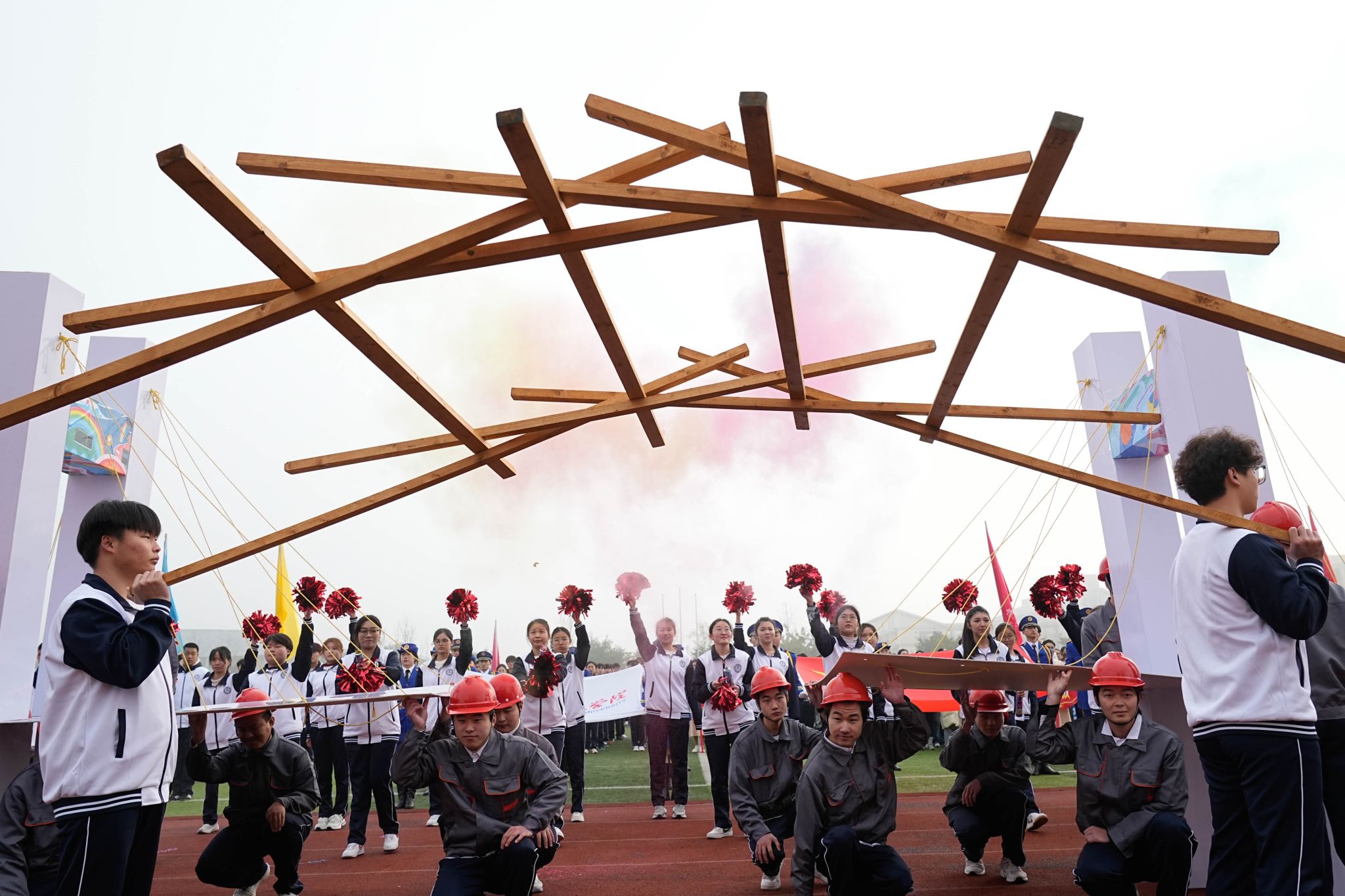 开幕式上,建工公司方阵队伍气势浩荡,同学们身姿挺拔、步伐坚定,口号声响彻全场。方阵表演中,公司学子用十二根木条,搭建了一座没有一根铁钉的虹桥。队伍两边托起现代桥梁的钢铁脊梁,三维建模的蓝本在他们手中化作实体,为全校师生带来了一场视觉盛宴。
