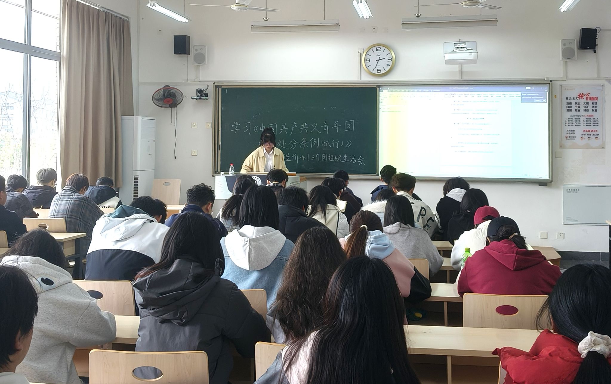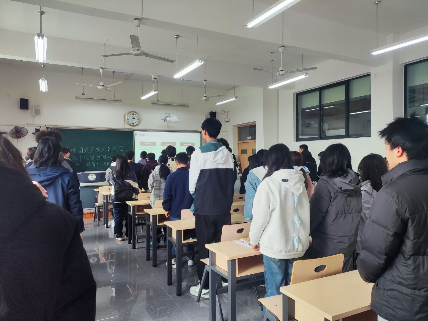 团组织生活会在庄严的团歌声中拉开序幕。首先,由各班团支书围绕深刻认识总则、团纪处分种类及责任区分、违反纪律行为的处分和团纪处分运用规则等内容进行了全文领学和重点解读。在随后的讨论环节,同学们积极参与,针对“如何在日常的学习生活中严守团内纪律”发表自己的想法。最后,团支书总结发言,梳理了团员们提出的共性问题与改进方向,并强调:纪律修养是青年成长的终身课题,希望全体同学在思想上树牢“红线意识”,在行动上践行“团员标准”。
