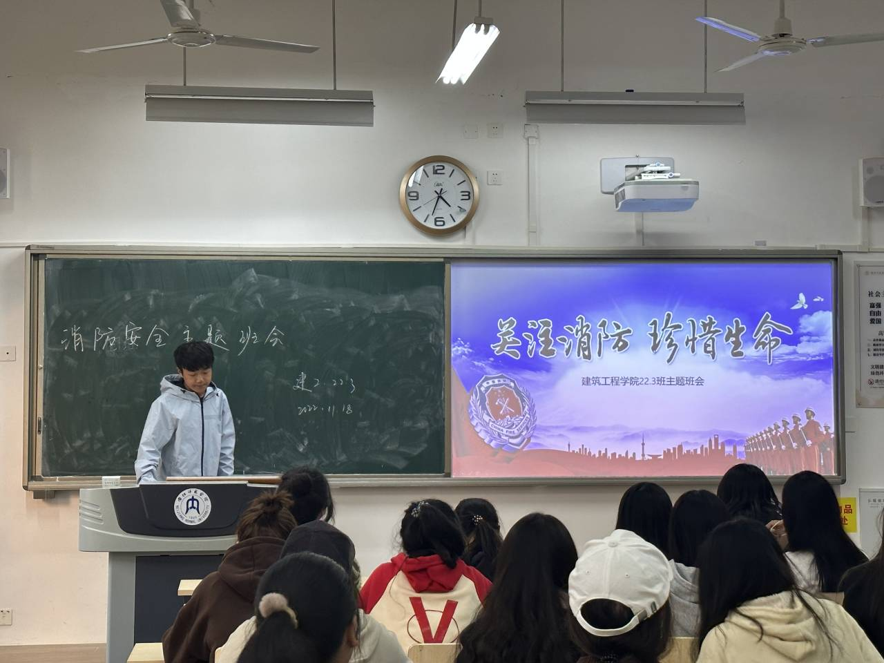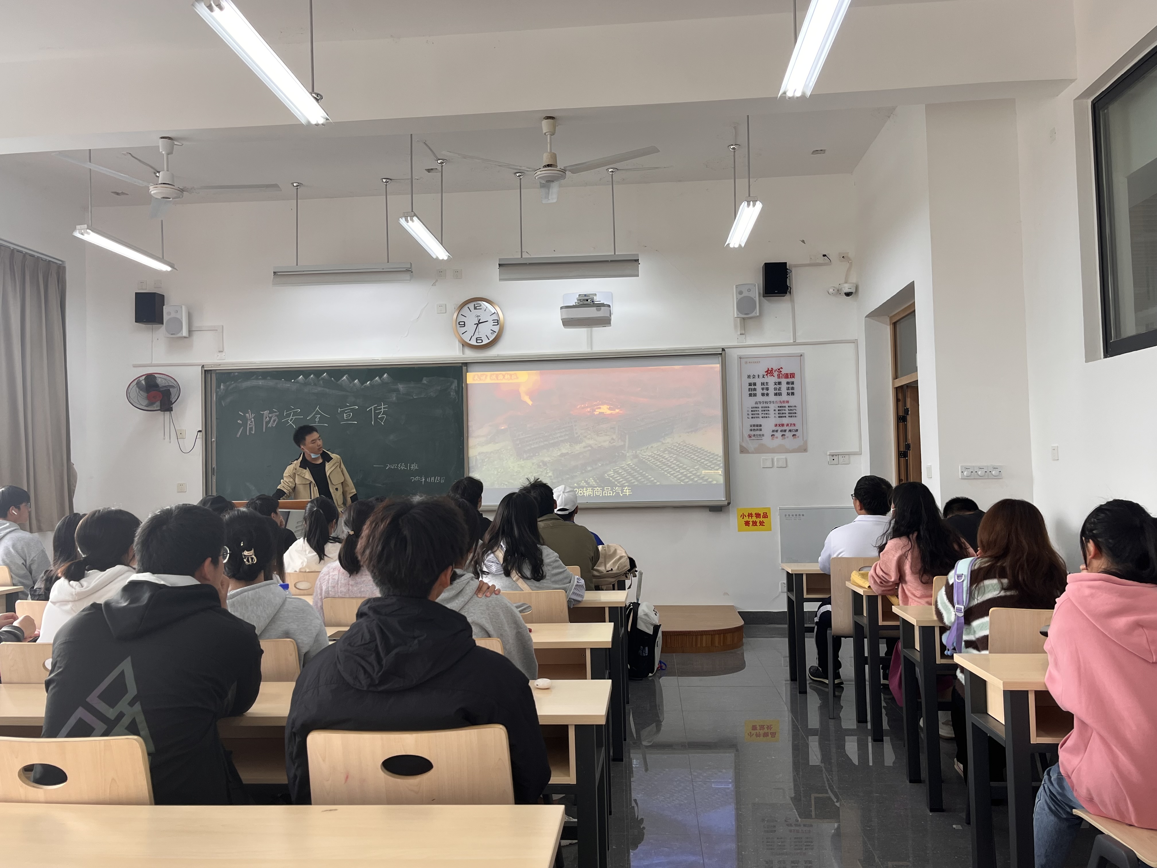 本次主题班会由各班班长和宣传委员共同开展,各班通过易班、微信、微博等线上线下相结合的教育方式,在加强法律法规和校内规章制度的教育的同时也让同学们懂得了如何遵守消防安全法。其次,通过播放消防安全相关视频并就此对同学们进行火灾逃生教育,让大家掌握一定的火灾逃生技能和避险知识。最后班长督促同学们注意寝室用电安全,禁止使用违禁物品,树立寝室消防安全意识。