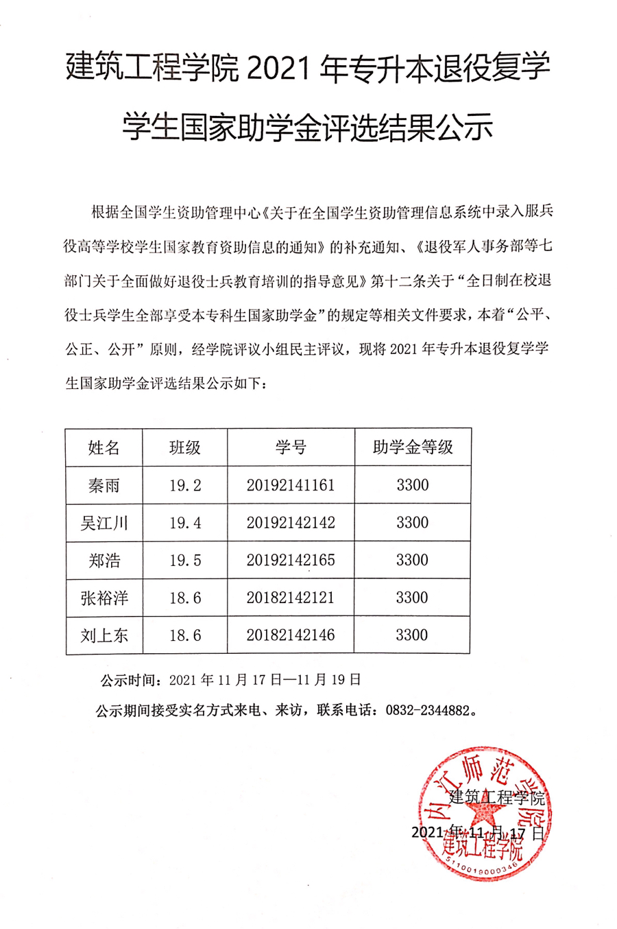 建筑工程公司2021年专升本退役复学员工国家助学金评选结果公示