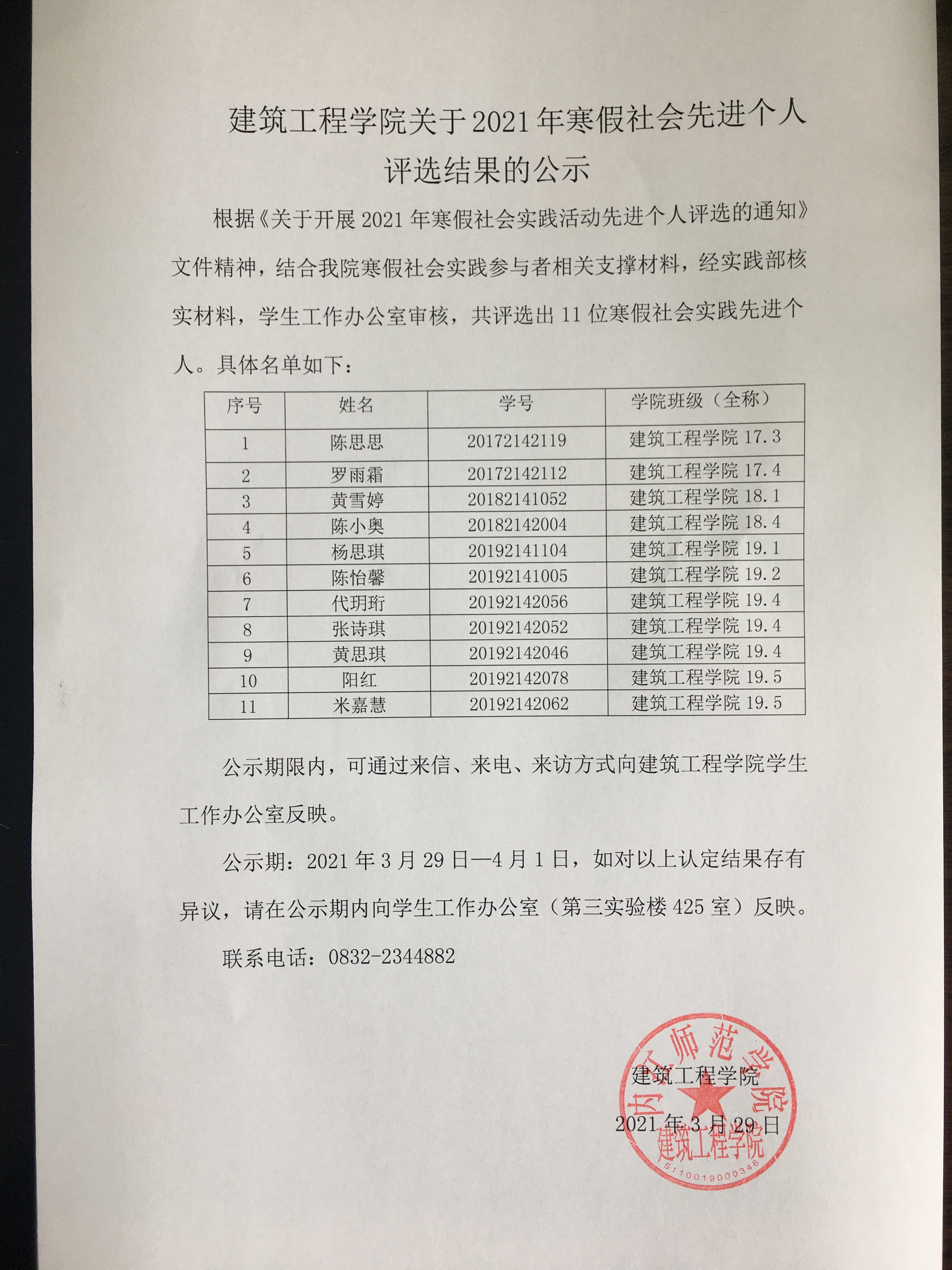 建筑工程公司关于2021年寒假社会先进个人评选结果的公示
