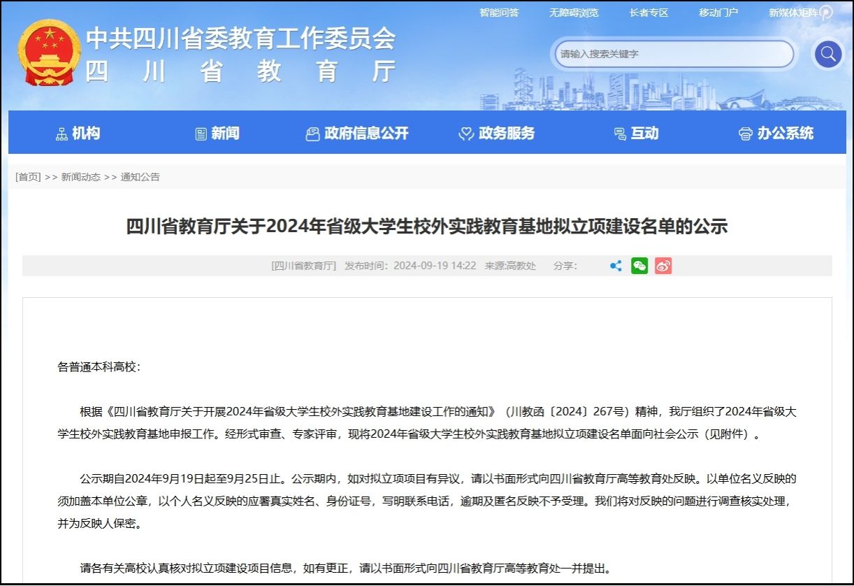 近日,四川省教育厅发布了《四川省教育厅关于2024年省级老员工校外实践教育基地拟立项建设名单的公示》,公司获批为2024年省级老员工校外实践教育基地。